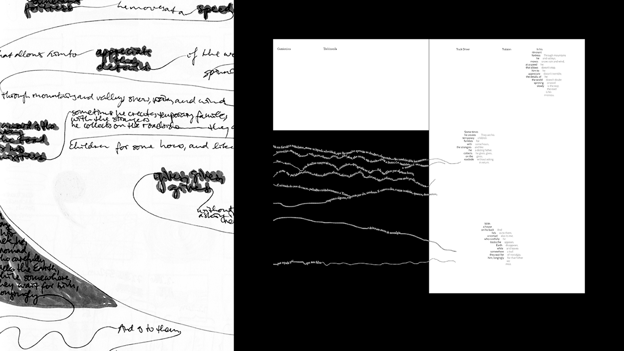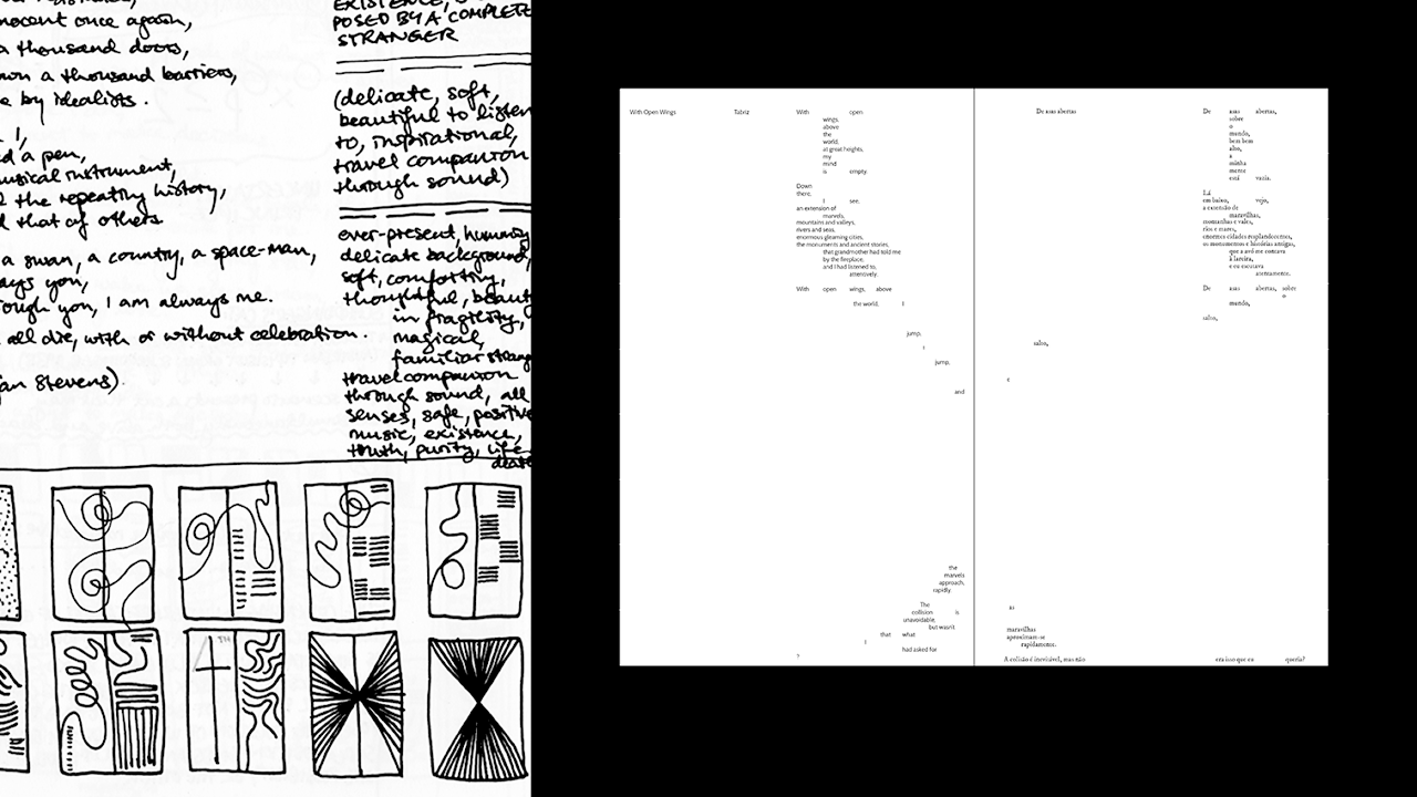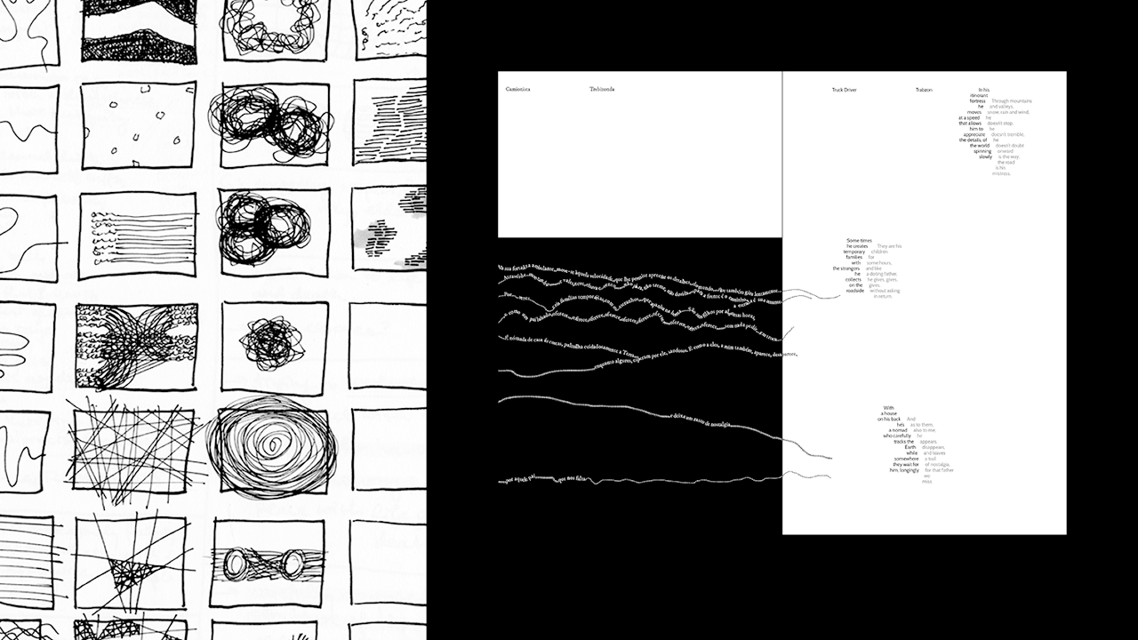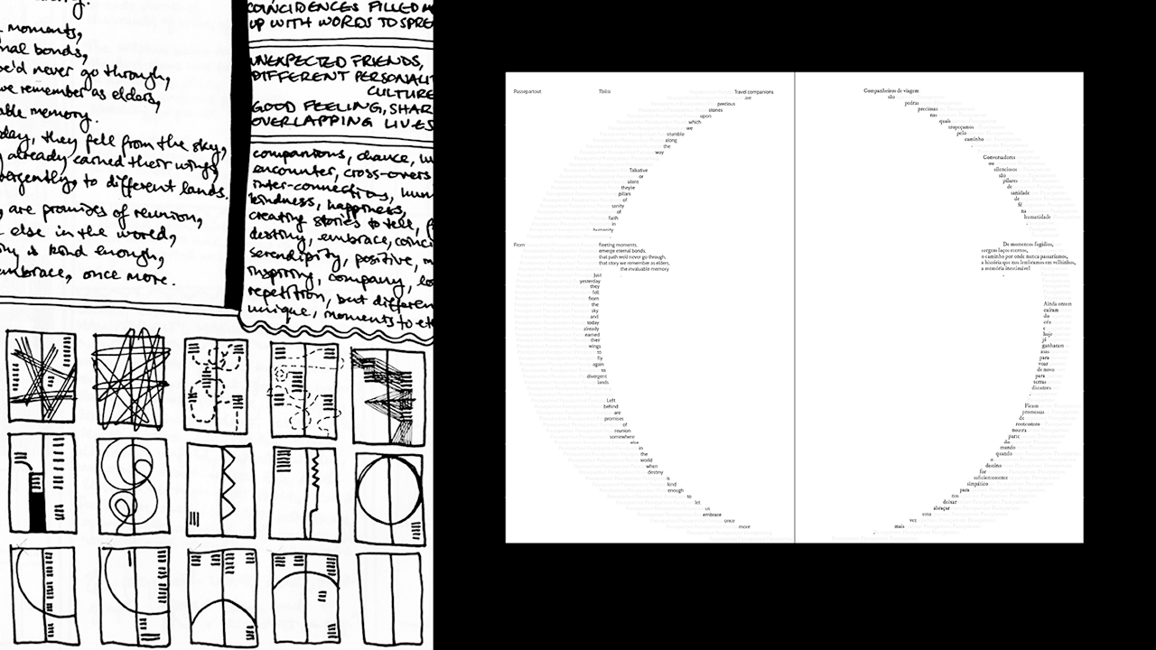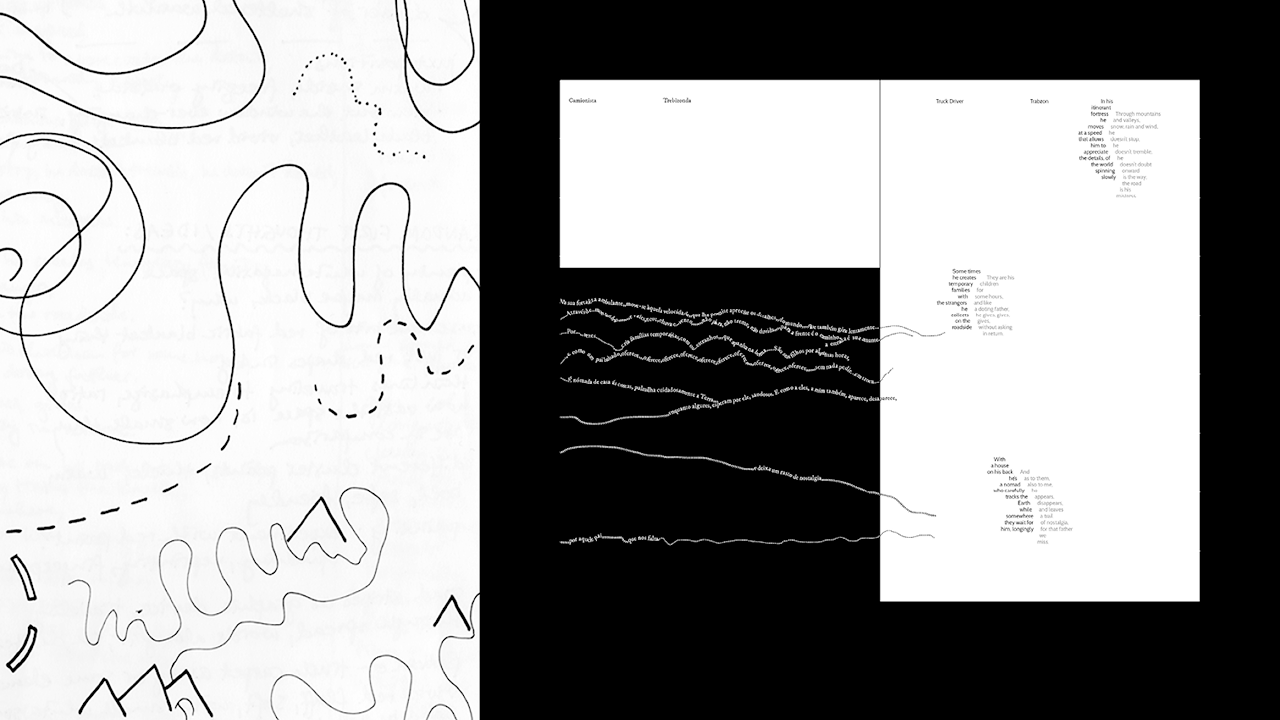 'Um Poema Errante / A Wandering Poem' is the printed collaboration between travelling poet Christian Marques and visual interpreter Angharad Hengyu Owen. A literary project unlike anything that has ever been published, it embodies a bi-disciplinary re-exploration of an eight-month journey from Europe, across the Middle East, to Asia: Undertaken by the author himself, crossing seven countries, covering roughly 11'500 kilometers by land, unearthing one poem a day. The result is a bilingual (English and Portuguese) collection of emotional imprints, where each poetic free-verse works hand in hand with its unique visualisation on paper, offering a multi-layered and inner-directed reading experience, and ultimately a voyage of sorts through printed words.